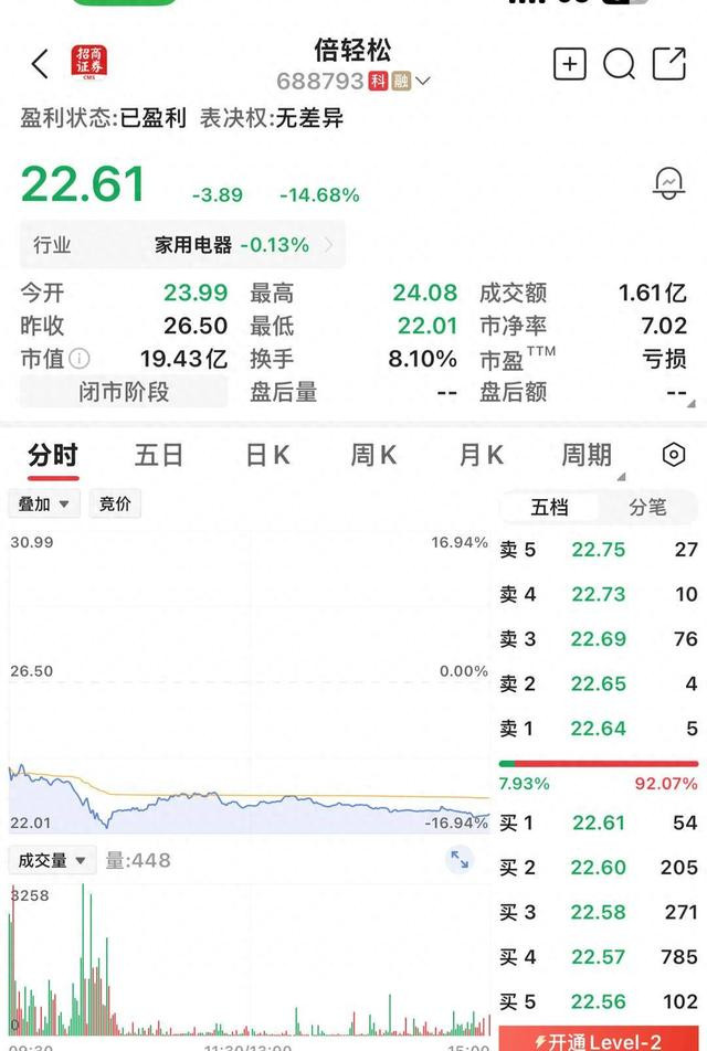 12月26日,倍轻松股价大跌,截至收盘跌超14%。目前市值19.43亿元。