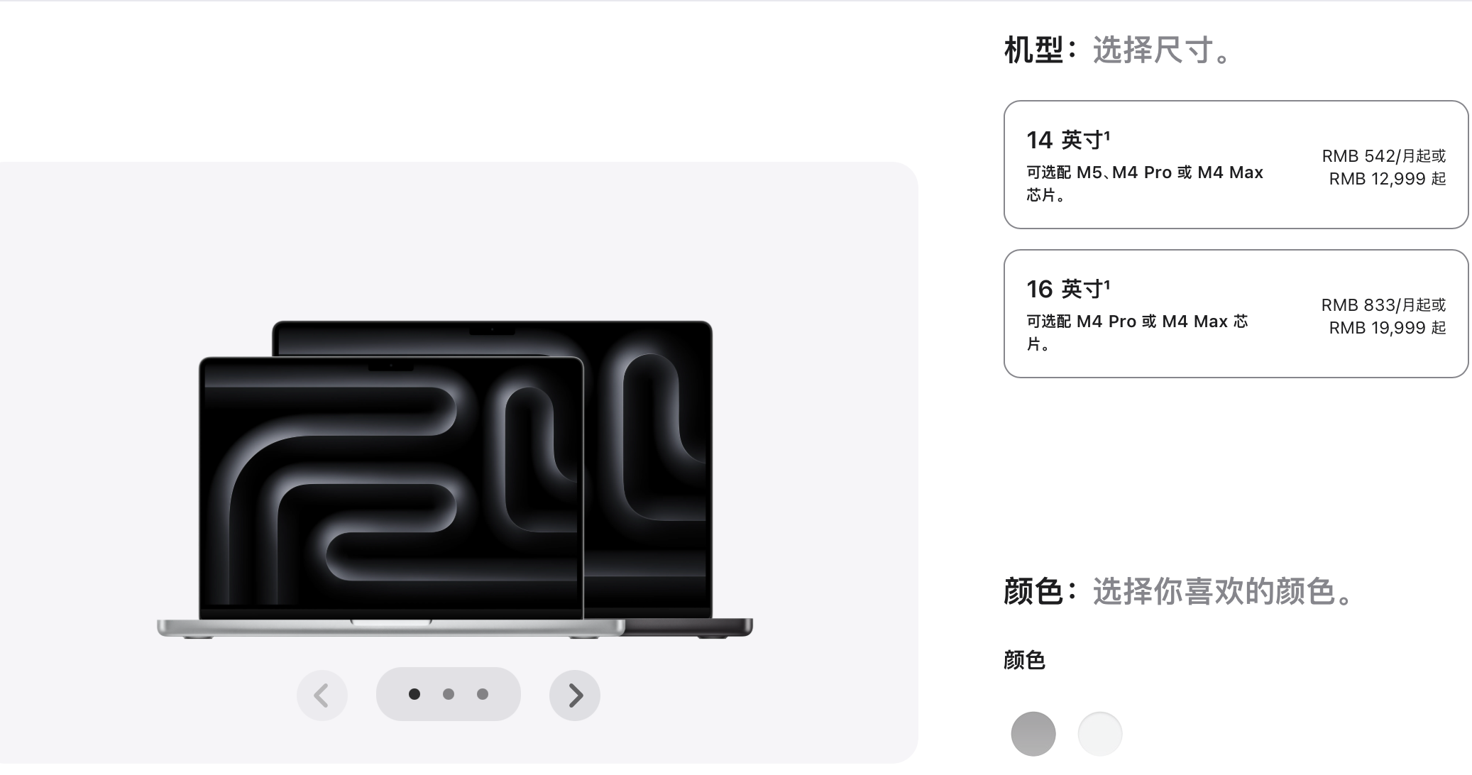 以MacBook Pro的订购页面为例,用户在进入页面后,首先需要确定屏幕尺寸,可在14英寸和16英寸之间做出选择,同时选定机身配色。之后,用户有机会升级选配纳米纹理显示屏,以获得更优质的视觉体验。接下来,用户要从对应尺寸机型所支持的M系列芯片及核心数选项中挑选适合自己需求的配置。在完成芯片选择后,还需自定义内存容量、固态硬盘存储空间,并根据实际情况选配电源适配器,最后确定键盘语言版本。(青山)